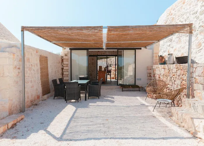 Trulli Meridiem Con Piscina距离Dolmen di Montalbano大约7公里,设有3间卧室和一个露台. 这栋别墅的房间配有内庭院 和气候控制并为住客提供大厨房.